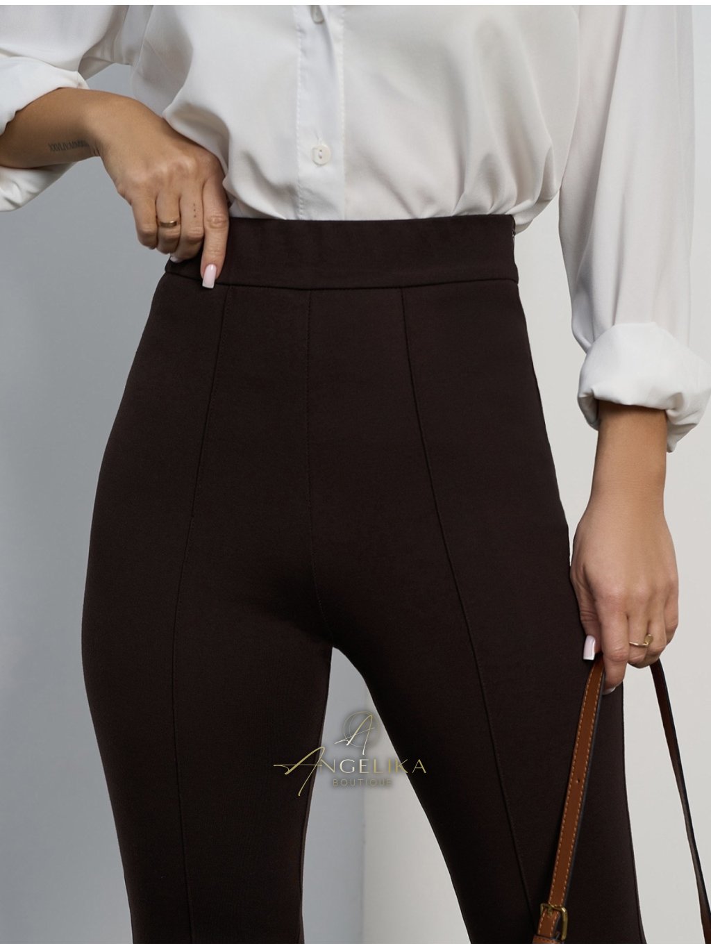 Kalhoty s vysokým pasem, přiléhavým vrškem a rozšířeným dolním dílem od kolen.