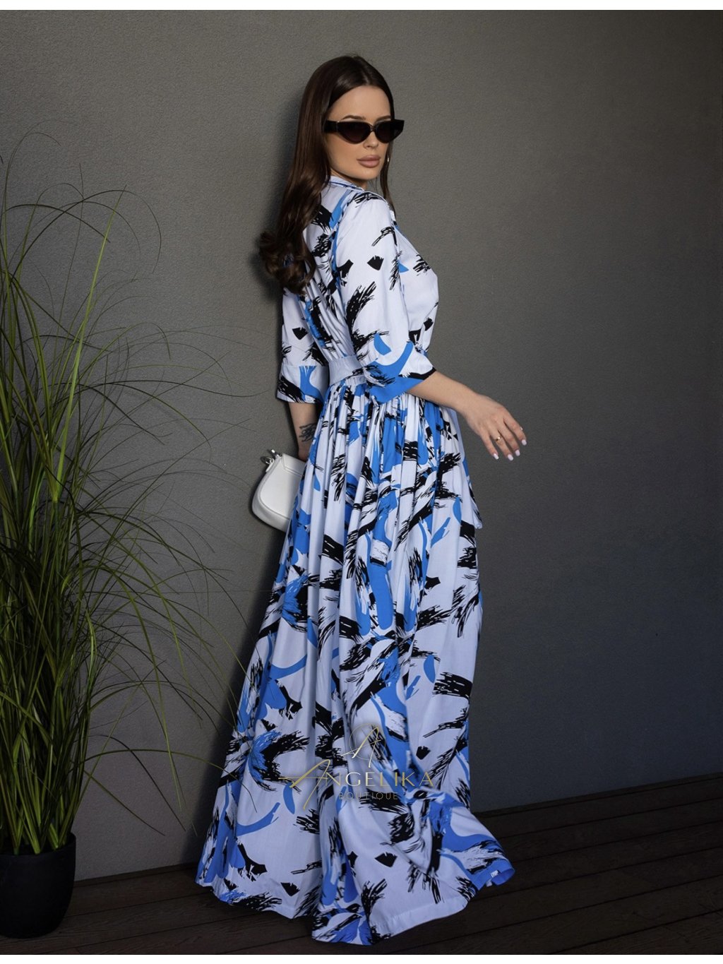 Dlouhé bavlněné, modrobílé šaty s rozšířeným spodním lemem a rozparkem vpředu.