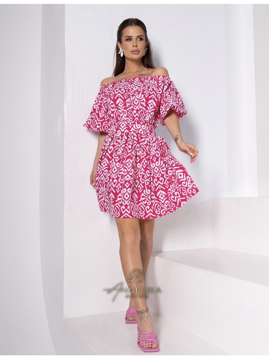 Malinové, měkké šaty s ornamentem a gumou podél průramku.