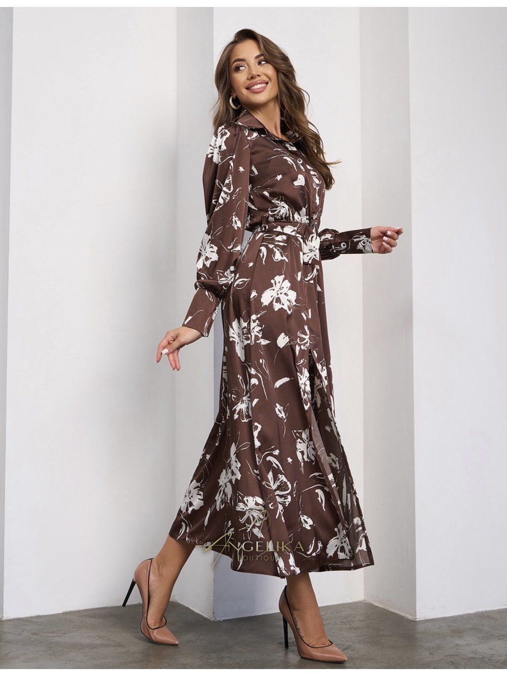 Hedvábné košilové šaty s krátkým zapínáním na knoflíky a dlouhými rukávy s manžetami.