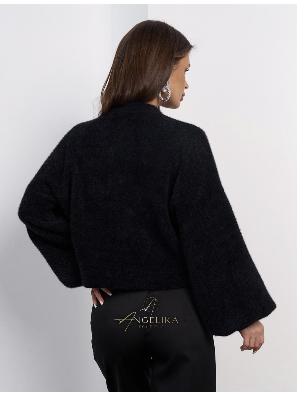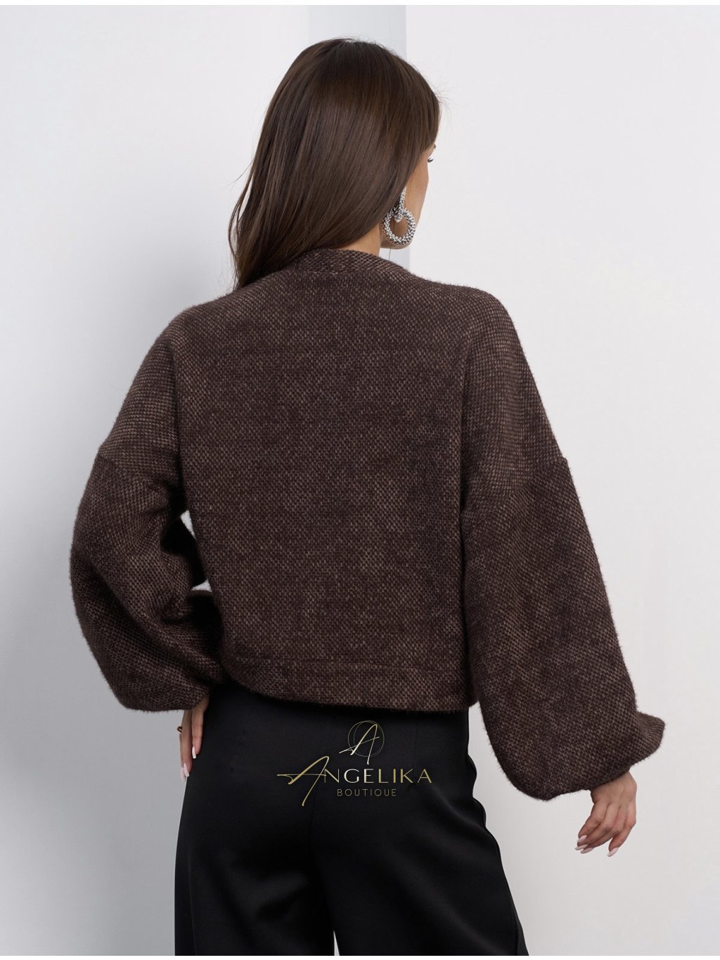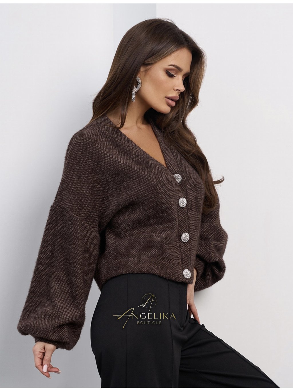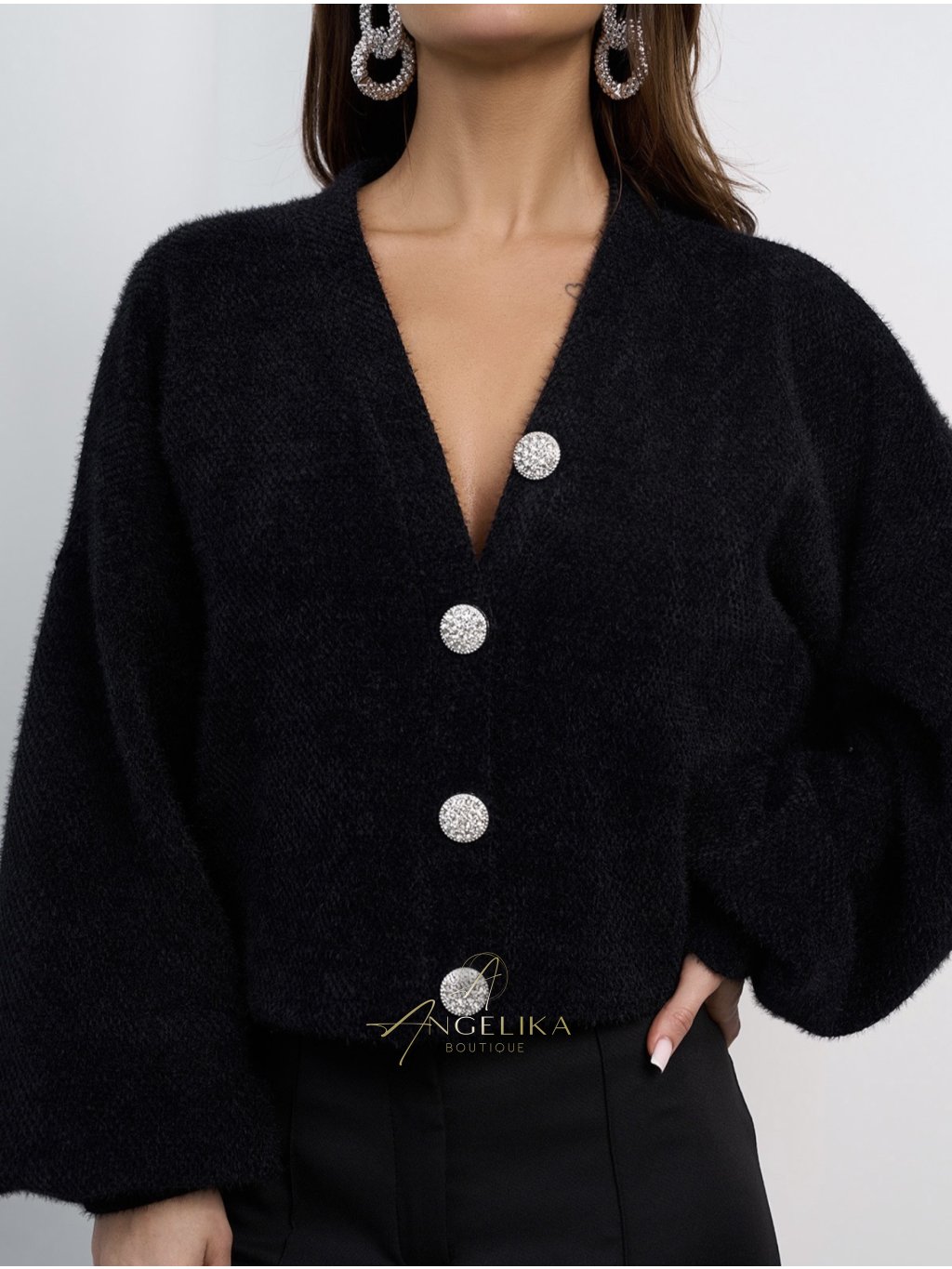 Krátký kardigan s knoflíky, vyrobený z nadýchané alpaky.