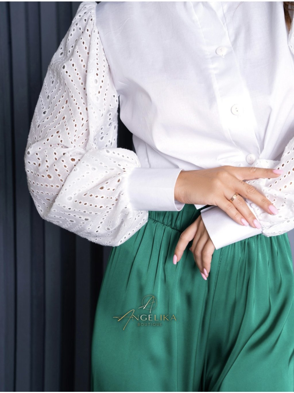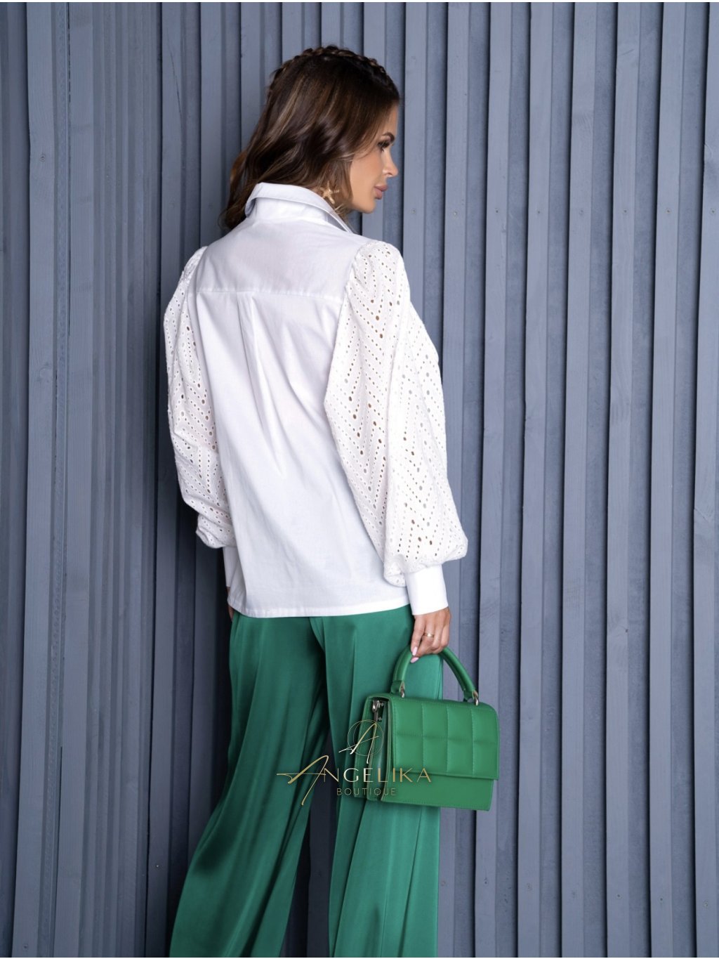 Model s objemnými rukávy na manžetách z lehké síťoviny s perforací.
