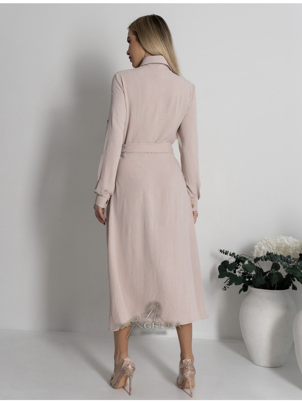 Model střední délky s klopami na hrudi a odnímatelným textilním páskem.