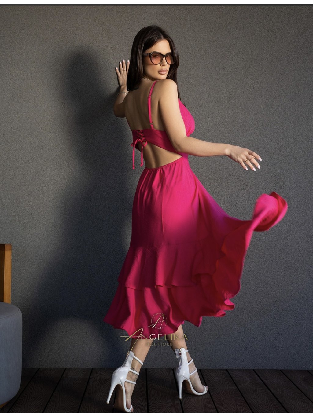 Lněné šato kraťasy zářivě malinové barvy, zdobené tunikovým topem s vlečkou.
