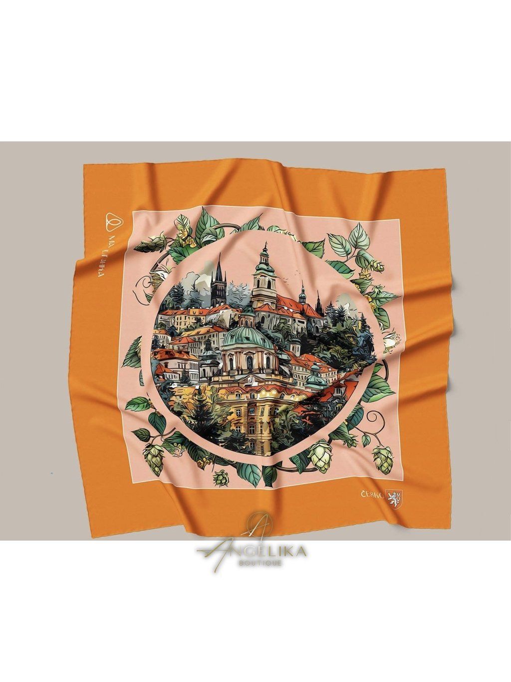 Dodejte svému outfitu elegantní detail v podobě designového šátku s motivem České republiky. Šátek zaujme precizním zpracováním a jemným leskem. Skvěle se hodí jako doplněk kolem krku, do vlasů nebo jako stylový detail na kabelku.