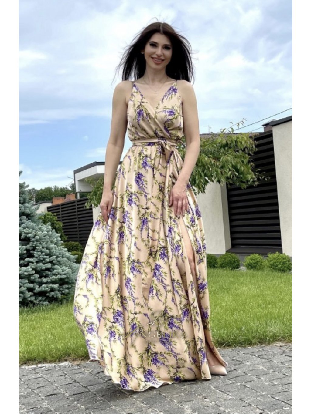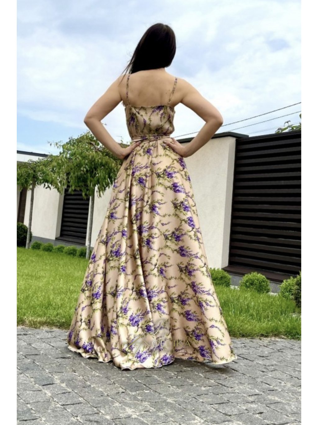 Tenká nastavitelná ramínka, elastická vsadka v pase a dlouhá sukně s rozparkem podél nohavice.